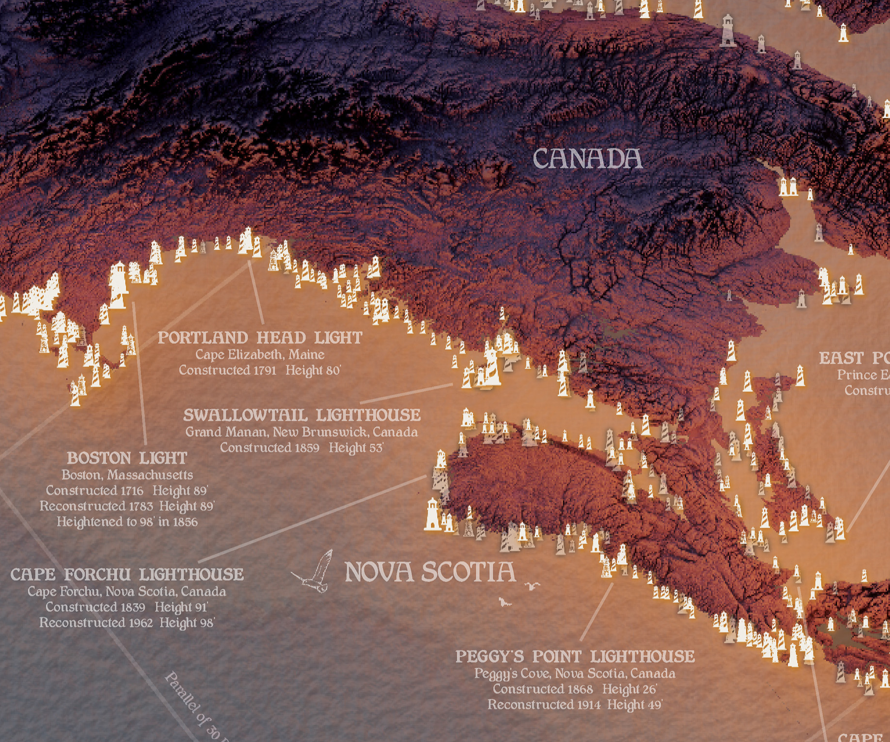 A 3D-rendered light simulation print map showing 650+ lighthouses dotting the Atlantic Coast of North and Central America. Click here for more info…
